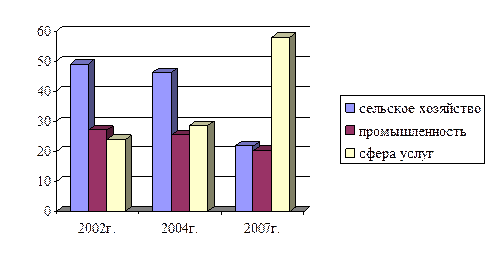 Источник: [19] Экспорт страны в 2007г. составил 962 млн. долларов США, тогда как импорт равнялся 3,42 млрд. долларов США. Таким образом, можно сделать вывод о том, что страна импортирует гораздо больше, чем экспортирует, то есть наблюдается зависимость от импорта. Кроме того, надо подчеркнуть, что свыше 90% всего объёма внешней торговли приходится на долю стран ЕС. Следует отметить, что Албания имеет огромную внешнюю задолженность. По состоянию на 2004г. внешний долг страны равен 1,55 млрд. долларов США. Также на поддержку развития страны в 2005г. было выделено 318,7млн долларов США. В основном, страна получает помощь от ЕС. В целом, государственный долг Албании равен 53,7% от ВВП, что является немаловажной проблемой экономики страны [19]. Таким образом, можно сделать выводы о том, что в последние несколько лет в экономическом развитии Албании установилась определённая стабильность, но ещё остаются нерешёнными несколько важных задач, среди них: дисбаланс во внешней торговле государства (значительное преобладание импорта над экспортом) и большой государственный долг. Глава 2. Характеристика хозяйственного комплекса Республики Албания 2.1 Отраслевая структура хозяйственного комплекса Албании Албания – аграрно-индустриальная страна. Долгое время сельское хозяйство составляло 45-50% ВВП. Так, например, в 2002г. отраслевая структура экономики выглядела таким образом: сельское хозяйство и рыболовство – 49% ВВП, промышленность и строительство – 27%, сфера услуг – 24%. Но постепенно пропорции изменялись в сторону развития сферы услуг. Уже в 2004г. распределение ВВП по отраслям хозяйства Албании выглядело так: сельское хозяйство – 46,2% , промышленность – 25,4%, а сфера услуг – 28,4%. Стоит отметить, что значительный сдвиг произошёл за последние 3-4 года, ведь уже в 2007г. по оценкам сфера услуг в стране составляла 58% ВВП, тогда как доля сельского хозяйства уменьшилась до 21,7% (см. рис. 10).