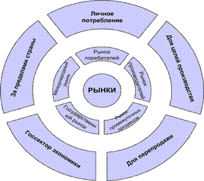 Рис 1.2 Основные силы, действующие в микросреде фирмы Фирма. Разрабатывая маркетинговые планы, руководители службы маркетинга должны учитывать интересы прочих групп внутри самой фирмы, таких, как высшее руководство, финансовая служба, службы НИОКР и материально-технического снабжения, производственная служба, бухгалтерия. Все эти группы входят в состав микросреды фирмы. Высший эшелон руководства определяет цели фирмы, ее общие стратегические установки и текущую политику. Управляющие по маркетингу должны принимать решения, не противоречащие планам высшего руководства. Служба маркетинга должна работать в тесном сотрудничестве с подразделениями фирмы. Финансовая служба решает проблемы наличия и использования средств. Служба НИОКР занимается конструированием новых изделий и разработкой эффективных методов производства. Служба материально-технического снабжения заботится о поставках деталей и узлов для производства. Производственная служба несет ответственность за выпуск продукции. Бухгалтерия следит за доходами и расходами, помогая службе маркетинга быть в курсе дела, насколько успешно идет достижение намеченных ею целей. Деятельность всех подразделений так или иначе влияет на планы и на действия службы маркетинга. Поставщики. Поставщики — это фирмы и отдельные лица, которые обеспечивают компанию, ее конкурентов материальными ресурсами, необходимыми для производства конкретных товаров или услуг. События в «среде поставщиков» могут серьезно повлиять на маркетинговую деятельность фирмы. Управляющие по маркетингу должны следить за ценами на закупаемые материалы, поскольку рост цен на них ведет к повышению цен и на продукцию фирмы. Недостаток тех или иных материалов, забастовки и прочие события могут нарушить регулярность поставок и график отгрузки товаров заказчикам. Как следствие, в краткосрочном плане будут упущены возможности сбыта, в долгосрочном — подорвана репутация фирмы. Маркетинговые посредники. Существуют фирмы, которые помогают компании в продвижении, сбыте и распространении ее товаров среди клиентуры. К ним относятся торговые посредники, фирмы-организаторы товародвижения, агентства по оказанию маркетинговых услуг и кредитно-финансовые учреждения. Клиентура. Фирме необходимо тщательно изучать своих клиентов. Основными типами клиентурных рынков являются (рис.1.3): Она может выступать на клиентурных рынках пяти типов: 1) потребительский рынок — отдельные лица и домохозяйства, приобретающие товары и услуги для личного потребления; 2) рынок предприятий — организации, приобретающие товары и услуги для использования их в процессе производства; 3) рынок промежуточных продавцов — организации, приобретающие товары и услуги для последующей перепродажи их с прибылью; 4) рынок государственных учреждений — государственные организации, приобретающие товары и услуги либо для последующего их использования в сфере коммунальных услуг, либо для передачи этих товаров и услуг тем, кто в них нуждается; 5) международный рынок— покупатели за пределами страны, в том числе зарубежные потребители, производители, промежуточные продавцы и государственные учреждения. Каждому типу рынка присущи свои специфические черты, которые продавцу необходимо изучать.