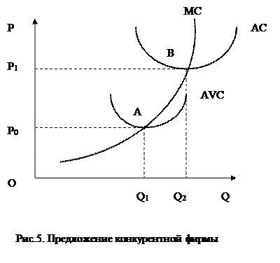 Таблица 1. Спрос на продукт самостоятельной фирмы и ее доход в условиях чистой конкуренции. Средний, валовой и предельный доход Очевидно, что кривая спроса на продукцию фирмы является в то же время кривой дохода. То, что в столбце (1) табл.1 обозначено как цена на единицу продукта для покупателя, представляет собой выручку от продажи единицы продукта, или средний доход продавца. Утверждение о том, что покупатель должен заплатить цену 131 дол. за единицу продукта, тождественно следующему тезису: выручка от единицы продукта, или средний доход, полученный продавцом, составляет 131 дол. Цена и средний доход – это одно и то же, но с разных точек зрения. Валовой доход при любом объеме продаж можно легко определить путем умножения цены на соответствующее количество продукции, которое фирма способна продать (столбец (3)). В данном случае валовой доход увеличивается на постоянную величину 131 дол. – с каждой дополнительной единицы продаж. Каждое проданное изделие прибавляет к валовому доходу свою цену. Всякий раз, когда фирма планирует какое-либо изменение объема производства, ее интересует, как изменится доход в результате этого сдвига в выпуске. Каким будет дополнительный доход от продажи еще одной единицы продукта? Предельный доход есть изменение валового дохода, то есть добавочный доход, который является результатом продажи еще одной единицы продукта. Как показано в столбце (3) табл.1, валовой доход равен нулю, когда продано ноль единиц продукта. Первая проданная единица увеличивает валовой доход с нуля до 131 дол. Предельный доход – увеличение валового дохода в результате продажи первой единицы продукта – составляет, следовательно, 131 дол. Вторая проданная единица увеличивает валовой доход со 131 до 262 дол., то есть предельный доход опять составит 131 дол. В столбце (4) предельный доход есть постоянная величина, равная 131 дол., поскольку именно на такую неизменную величину возрастает валовой доход по мере каждой дополнительной единицы продукта.[6] 2.2 Краткосрочный период. В краткосрочном периоде у нее имеются две возможности: продолжить производство с минимальными убытками или прекратить производство. В случае продолжения производства убытки фирмы будут равны разности общих издержек и выручки: TC - pQ, где Q – равновесный объем производства. В случае прекращения производства выручка фирмы равна нулю, а ее убытки равны общим издержкам, которые при нулевом выпуске равны постоянным издержкам FC. Фирма прекратит производство, если издержки в первом случае больше издержек во втором случае, то есть: TC – pQ > FC,отсюда p < AVC, где AVC – средние переменные издержки. Таким образом, убыточной конкурентной фирме целесообразно прекращать производство в случае, когда рыночная цена продукта опускается ниже минимального значения средних переменных издержек. Иными словами, минимальная цена индивидуального предложения конкурентной фирмы равна минимуму средних переменных издержек.Рассмотрим теперь вопрос о форме кривой индивидуального предложения конкурентной фирмы. Из условия равновесия следует, что при каждой цене p (большей минимума средних переменных издержек) конкурентная фирма будет производить и предлагать объем продукции S, который обеспечит равенство предельных издержек и данной цены, то есть: p = MC (S). Таким образом, функция предельных издержек устана