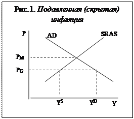 PG – цена, установленная государством, YS – величина совокупного выпуска (количество продукции, которое произведено и предложено к продаже производителями), YD – величина совокупного спроса (количество продукции, которую хотели бы купить потребители). Разница между YD и YS есть не что иное, как дефицит. Главная форма проявления скрытой инфляции – дефицит товаров Дефицит служит формой проявления инфляции, поскольку одной из характерных черт инфляции является снижение покупательной способности денег. Дефицит означает, что деньги вообще не обладают покупательной способностью, поскольку человек не может на них ничего купить. Скрытая инфляция – характеризуется снижением качества товаров и услуг при неизменном уровне цен. Инфляция захватывает и инвестиционную сферу, официальная статистика не отражает рост уровня государственных розничных цен из-за произвольно выбранной потребительской корзины. Подобная ситуация была характерна СССР, Болгарии и Румынии в конце 80-х годов ХХ столетия. 3. Причины инфляции Если критерием выделения типов инфляции выступает причина инфляции , то различают: - инфляцию спроса - инфляцию издержек Выделяют две основные причины инфляции: 1) увеличение совокупного спроса и 2) сокращение совокупного предложения . В соответствии с причиной, обусловившей рост общего уровня цен различают два типа инфляции: инфляцию спроса и инфляцию издержек. · Если причиной инфляции служит рост совокупного спроса , то такой тип называется инфляцией спроса . Инфляция спроса - следствие увеличения платежеспособного номинального спроса при неизменном или отстающем от него предложении товаров. Это наиболее простой, исторически первый тип инфляции, следствие избыточной денежной эмиссии или существенных изменений в скорости оборота денежной массы. Итак, рост совокупного спроса может быть вызван либо увеличением любого из компонентов совокупных расходов (потребительских, инвестиционных, государственных и чистого экспорта), либо увеличением предложения денег . Основной причиной инфляции спроса большинство экономистов (особенно представители школы монетаризма) считают увеличение денежной массы (предложения денег), приходя к этому выводу из анализа уравнения количественной теории денег (также называемого уравнением обмена или уравнением Фишера). Как отмечал глава монетаризма, известный американский экономист, лауреат Нобелевской премии Милтон Фридман: «Инфляция всегда и повсеместно есть чисто денежное явление». Вспомним уравнение количественной теории денег :