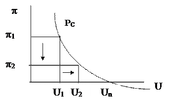 u* u2 u Рис. 7 Сдвиг кривой Филлипса при негативном шоке предложения В результате общий вид уравнения кривой Филлипса: p = p е - g (u – u*) + e . Наклон краткосрочной кривой Филлипса . Кривая имеет отрицательный наклон , что объясняется обратной зависимостью между уровнем инфляции (p) и уровнем безработицы (u ) в краткосрочном периоде (на это указывает знак «минус» перед коэффициентом g). Угол наклона кривой Филлипса характеризует коэффициент g. Чем он больше, тем кривая более крутая, что означает, что даже небольшое отклонение уровня фактической безработицы от своего естественного уровня ведет к значительному изменению уровня инфляции. Сдвиги краткосрочной кривой Филлипса обусловлены: - изменением инфляционных ожиданий (pе ). Рост инфляционных ожиданий приводит к сдвигу кривой Филлипса вправо, а снижение инфляционных ожиданий сдвигает кривую Филлипса влево. - шоками предложения (e). Негативный шок предложения сдвигает кривую Филлипса вправо, позитивный – соответственно влево. Если кривая Филлипса сдвигается вправо растет и уровень безработицы, и уровень инфляции, если она сдвигается влево, и тот, и другой уровень снижаются. Из уравнения кривой Филлипса следует, что инфляцию определяют три фактора: · уровень ожидаемой инфляции pе , отражая инерционный характер инфляции - это означает, что инфляция в прошлом порождает инфляцию в будущем; · циклическая безработица - отклонение фактического уровня безработицы от ее естественного уровня (u – u* ). Низкая безработица, что соответствует высокому уровню совокупного спроса, подталкивает инфляцию вверх. Причиной роста уровня цен в этом случае выступает рост совокупного спроса, следовательно, это инфляция спроса. Снижение совокупного спроса повышает уровень безработицы, что ведет к снижению темпа инфляции. · шоки предложения . Негативные шоки предложения ускоряют инфляцию и обусловливают инфляцию издержек . Таким образом, первый фактор (инфляционные ожидания) показывает причину существования инфляции, а два последних фактора (циклическая безработица и шоки предложения) представляет собой причины ускорения инфляции. Долгосрочная кривая Филлипса. Обратная зависимость между инфляцией и безработицей наблюдается только в краткосрочном периоде, поэтому отрицательный наклон имеет краткосрочная кривая Филлипса (short-run Phillips curve - S R PC ) и дилемма: инфляция или безработица – может наблюдаться только в краткосрочном периоде.
