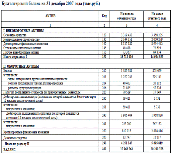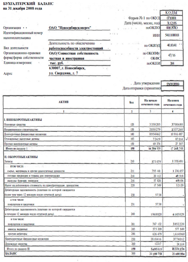 = Δ RλF = RλF - Rλp 3. Рассмотрим влияние оборачиваемости оборотных активов . Рассчитаем рентабельность для отчетного периода. ЕЕ можно рассматривать как условную рентабельность при условии, что изменились значения всех трех факторов: рентабельность продукции, фондоемкости и оборачиваемости оборотных активов. Δ RλE = R1 - RλF 2. АНАЛИЗ ФОРМИРОВАНИЯ И РАСПРЕДЕЛЕНИЯ ПРИБЫЛИ ОАО «НОВОСИБИРСКЭНЕРГО» 2.1 Экономическая характеристика ОАО «Новосибирскэнерго» Исследования проведено на материалах ОАО «Новосибирскэнерго». Основным видом деятельности общества является производство электрической и тепловой энергии. Энергокомпания была создана в апреле 1931 г., в 1993 преобразована в открытое акционерное общество. В состав генерирующих мощностей энергосистемы входят пять тепловых электрических станций: ТЭЦ-2, ТЭЦ-3, ТЭЦ-4, ТЭЦ-5 в Новосибирске и Барабинская ТЭЦ. В структуре энергокомпании 2 филиала: «Генерация» и «Локальные котельные». Кроме того, создан ряд дочерних компаний, профилированных по видам деятельности. Общая численность персонала группы компаний ОАО «Новосибирскэнерго» — 9 343 человека. По состоянию на 31.12.2008г уставный капитал Общества составляет 160 648 070 руб. Он разделен на 13 519 075 обыкновенных акций номинальной стоимостью 10 рублей каждая и 2 545 732 привилегированных акций типа А номинальной стоимостью 10 рублей каждая. Высшим органом управления компанией является ее Общее собрание акционеров. Для того, чтобы наиболее полно отразить финансовое состояние ОАО «Новосибирскэнерго», рассмотрим показатели структуры активов и капитала предприятия за 2 года. Валюта баланса ОАО «Новосибирскэнерго» со временем изменилась. В 2008г., по сравнению с 2007 г., валюта баланса возросла, причем по активам значительно (таблица 2.1). В активах баланса значительное изменение за 2007 – 2008 гг. в сторону роста претерпела краткосрочная дебиторская задолженность, что говорит о Таблица 2.1-Агрегированный баланс ОАО «Новосибирскэнерго» за 2007 – 2008 гг.
