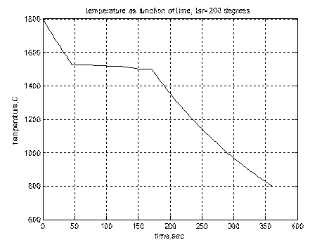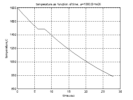 Программирование задачи: Оформленная в системе MATLAB программа по описанному выше итерационному алгоритму: %Programma of coling Fe-0.16C alloy clear; c0=0.16;C=444;R=7000;L=277000;a=126.5;F=0.025;V=0.00025; t(1)=1800;tp=1499;tk=800;tsr=20;dtau=1;m(1)=0.854;n=10000; tliq=1539-78.43*c0; %step_1 for i=1:n; if t>tliq; t(i+1)=t(i)-a*F*dtau*(t(i)-tsr)./(V*C*R); end;end; s1=length(t); %step_2 for i=s1:n; if t>tp; t(i+1)=t(i)+a*F*dtau*(t(i)-tsr)./(-V*C*R-0.0016*V*L*R/(15.77-0.01025*t(i)).^2); end;end; s2=length(t); %step_3 m(s2)=0.854; for i=s2:n; if m<1; m(i+1)=m(i)+a*F*dtau*(t(i)-tsr)./(V*L*R); t(i+1)=t(i); end;end; s3=length(t); %step4 for i=s3:n; if t>tk; t(i+1)=t(i)-a*F*dtau*(t(i)-tsr)./(V*C*R); end;end; sk=length(t); h=0:dtau:dtau*(length(t)-1); plot(h,t); grid title('temperature as function of time') ylabel('temperature,C') xlabel('time,sec'); Полученная в результате запуска программы математическая модель процесса кристаллизации сплава системы Fe – 0,16 % C
