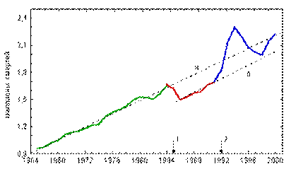 Общее количество смертей в России 1965 — 2000 гг. 1 – начало антиалкогольной кампании; 2 – начало рыночных реформ; а – линия регрессии для 1965 — 1984; б – для 1986 — 1991. Заметное снижение смертности началось уже через 2-3 месяца после начала кампании, а очевидное — через полтора года: на 203,5 тысячи или на 12,3 % (1986 г.) от общего числа смертей в 1984 г. За это время среднедушевое потребление алкоголя снизилось на 3,7 литра, при том, что зависимость смертности от потребления была строго линейной в 1984 — 1986 гг. Из этого следует, что в начале антиалкогольной кампании при потребления 10 — 15 литров среднедушевого алкоголя снижение потребления на каждый литр алкоголя уменьшало общее количество смертей на 3,3 %. Доля смертей резко увеличивается, если расчёты вести в отношении мужчин 35 — 59 лет, для которых этот показатель снизился на 25,4 % или 6,9 % на каждый литр среднедушевого алкоголя. Для оценки изменения смертности в связи с алкоголем во время антиалкогольной кампании важно, что линия регрессии, рассчитанная для 1965 — 1984 гг. может служить прогнозом того, какова была бы смертность после 1984 г., если бы не началась антиалкогольная кампания. После резкого снижения смертности в 1985 — 1986 гг. и вплоть до 1991 года смертность установилась на новом уровне. При этом сохранялся практически тот же темп прироста количества смертей (38,6 тысяч в год). Располагая этими данными, можно рассчитать количество людей, которые могли умереть, но не умерли во время антиалкогольной кампании. Это количество определяется отклонением от прогностической линии регрессии, что составляет 1,22 миллиона человек или 204 тысячи в год. Во время антиалкогольной кампании количество смертей снизилось не только у мужчин, но и у женщин. Линейность отношений алкоголя и смертности позволяет перейти от показателя смертности на литр алкоголя к смертности на 100 000 мужского и женского населения: 944,3 мужчин и 231,5 женщин. Располагая этими числами можно рассчитать полные алкогольные потери страны в 1984 г.: 344,4 тысяч мужчин и 168,7 тысяч женщин (всего 513,1 тысяч или 31 %) — прямые (смерти при отравлении алкоголем, в связи с алкогольными психозами или циррозами печени, острыми алкогольными панкреатитами и алкоголизмом) и непрямые алкогольные потери (дорожно-транспортные происшествия со смертельным исходом, связанные со спиртным, другие насильственные или неестественные смерти, смерти в связи с соматическими заболеваниями, осложнившими алкоголизм или пьянство или осложнёнными алкоголизмом или пьянством). Представляет интерес диагностический состав алкогольной смертности. У мужчин в 1985 — 1986 гг. существенно снизился уровень почти всех классов смерти , которые составляют подавляющее большинство всех смертей (77,8 % в 1986 — 1991 гг.). В этот же период существенное снижение смертности женщин произошло только в группе сердечно-сосудистых и внешних (насильственных, неестественных) причин (73,0 % всех смертей в 1986 — 1991 гг.). Исключение составили только новообразования, инфекционные и паразитарные заболевания. Таким образом, большинство классов причин смертности мужчин синхронно «откликнулись» снижением на уменьшение потребления алкоголя во время антиалкогольной кампании, что позволяет связать эти формально неалкогольные заболевания и смерти с потреблением алкоголя. По существу — это непрямые алкогольные потери, хотя фактически