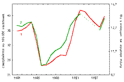 Число самоубийств на 100 000 населения (1) и потребление алкоголя в литрах на человека в год (2), Россия, 1981 — 1999 гг. Убийства — всегда двусторонний процесс, где есть убийца (убийцы) и жертва (жертвы). Точно также двусторонней является тема «алкоголь и убийства», поскольку пьяным может быть как убитый, так и убийца (или оба), а результат один. В 1984 г. убийства составляли 7,7 % общего числа смертей от внешних причин или 11 039 мужчин и 5 042 женщины (всего 16 081 человек). В России убитые с алкоголем в крови в 1981 — 1984 гг. составляли 65 %. Эта доля снизилась во время антиалкогольной кампании до 59 % (1988 г.), после чего начался её рост (в 1990 г. снова более 60 %). В результате антиалкогольной кампании произошло значительное снижение уровня убийств: с 12,1 в 1984 г. до 7,4 на 100 000 населения в 1987 г. на фоне снижения потребления алкоголя. Это явилось свидетельством связи этих двух явлений. Алкогольная смертность, связанная с болезнями системы кровообращения, существенно снизилась во время антиалкогольной кампании и выросла в период рыночных реформ. Главный механизм сопряжения сердечно-сосудистой патологии с употреблением алкоголя состоит в том, что хроническая алкогольная интоксикация осложняет течение уже существующих заболеваний этого класса и является дополнительным фактором риска: хроническая алкогольная интоксикация сокращает продолжительность жизни мужчин, имеющих заболевание сердечно-сосудистой системы, в среднем на 17 лет.