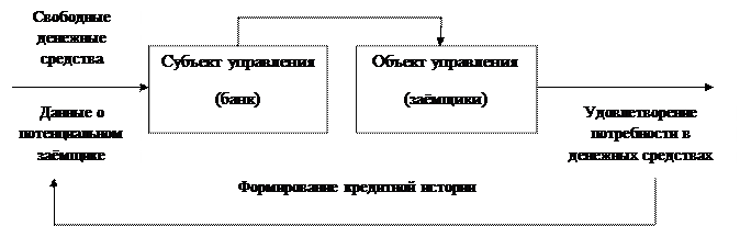 Рис. 2. Принципиальная система управления кредитными ресурсами банка Данная система управления предполагает воздействие банка на заёмщиков посредством оценки кредитоспособности и предоставления необходимых кредитных средств на основе данных о потенциальных заёмщиках, стремясь к максимальному удовлетворению потребностей заёмщиков в денежных средствах с непременным формированием кредитной истории. На современном этапе развития систем управления кредитными ресурсами процессная модель предоставления заёмных средств выглядит следующим образом: