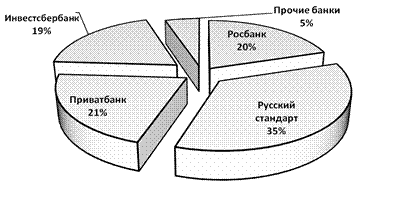 Рис. 4. Структура рынка потребительского экспресс-кредитования во Владимирском регионе по состоянию на 1 января 2008г.[9] 2. Потребительское автокредитование В отличие от экспресс-кредитования автокредит является чистым инструментом получения процентного дохода, поэтому автокредиты преобладают в розничном портфеле ВФ ОАО АКБ «Росбанк». Предпочтения в предоставлении данного вида кредита следует отдавать добросовестным заёмщикам, в том числе, и выявленным на стадии экспресс-кредитования. На начало 2008 года рынок автокредитования в целом проявляет тенденции к росту. Причины тому следующие. Во-первых, целевой характер данного кредита позволяет потребителям минимизировать издержки на пользование заёмными средствами за счёт более низких процентных ставок. Поэтому спрос на данный кредитный продукт постоянно растёт. Во-вторых, банки за счёт целевого характера кредита и вследствие работы исключительно с аккредитованными автосалонами могут значительно снизить кредитные риски. Снижение кредитных рисков происходит и за счёт обеспеченности данного вида кредита, когда в залог берётся приобретаемый автомобиль, застрахованный по всем видам страховых рисков. На рисунке 5 представлена структура рынка потребительского автокредитования во Владимирском регионе по состоянию на 1 января 2008г.