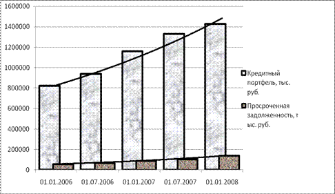 Рис. 7. Соотношение величин кредитного портфеля розничных кредитов ВФ ОАО АКБ «Росбанк» и просроченной задолженности за период с 1 января 2006 года по 1 января 2008 года Причины возникновения просроченной задолженности очень разнообразны. В ходе исследования, проведённого автором данного дипломного проекта, они были объединены в следующие группы по степени важности: 1. Низкая платёжная дисциплина заёмщиков; 2. Преднамеренная недобросовестность заёмщиков; 3. Снижение платёжеспособности заёмщика; 4. Неадекватное определение клиентом на этапе оформления кредита своего «свободного дохода», который может быть израсходован на обслуживание задолженности перед банком; 5. Операционные и технические проблемы в работе банка; 6. Клиентские ошибки. Первая группа причин включает всевозможные обстоятельства низкой платёжной дисциплины заёмщиков, такие как забывчивость или легкомысленное отношение к принятым обязательствам. Ко второй группе причин относятся различные виды мошенничества со стороны заёмщиков. К третьей группе причин относятся те, которые вызывают снижении платёжеспособности заёмщиков. На снижение платёжеспособности влияют множество факторов, таких как: ¾ потеря работы заёмщиком; ¾ нахождение на длительном курсе лечения; ¾ потеря имущества заёмщика в результате пожара, кражи и т.д.; ¾ увеличение количества иждивенцев; ¾ предстоящий призыв на срочную воинскую службу; ¾ уменьшение уровня оплаты труда; ¾ другие существенные обстоятельства. Прогнозировать возникновение той или иной форс-мажорной ситуации силами банка не представляется возможным, поэтому возникающие в данном случае риски являются случайными и наиболее эффективным способом защиты от их влияния является создание достаточного резерва на покрытие возможных потерь. В настоящее время четвертая группа причин возникновения просроченной задолженности является одной из наиболее управляемых. Для устранения данных причин необходимо прогнозирование «свободного дохода» клиента и, если рассчитанный экспертным путём «свободный доход» окажется ниже некоторого порогового значения, банк имеет право отказать в предоставлении кредита. Для управления данной группой причин возникновения просроченной задолженности целесообразно создать систему финансовой безопасности. Однако стандартной системы финансовой безопасности для банка в настоящее время не существует. Пятая группа причин включает: ¾ задержки в перечислении платежей клиентов «Почтой России» (или любой другой платёжной системы); ¾ задержки платежей при прохождении внутри банковской информационной системы; ¾ ошибки сотрудников банка при формировании графика платежей по кредиту; ¾ сбои в работе банковской информационной системы. Эти причины, являются техническими, поэтому приводят к так называемой «технической просроченной задолженности». К шестой группе причин возникновения просроченной задолженности можно отнести все неточности и ошибки, совершаемые клиентами непреднамеренно. Это может быть неверное указание специального банковского счёта для погашения кредита, номера кредитного договора и прочих реквизитов. Эти ошибки могут возникать, во-первых, вследствие низкой финансовой грамотности отдельных заёмщиков и, во-вторых, из-за невнимательности при заполнении платёжных документов. Устране