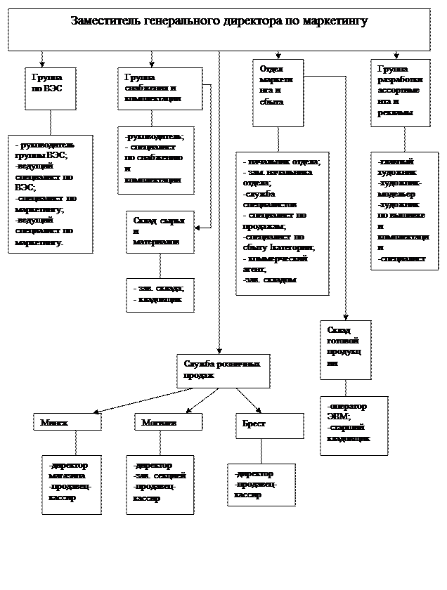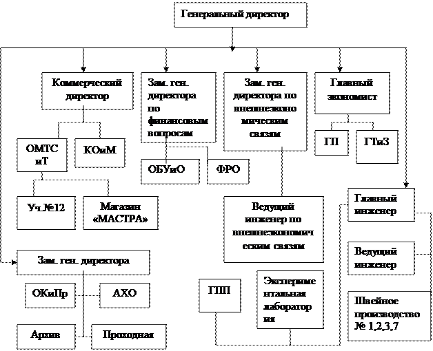 1.4. На сегодняшний день ОАО «Мастра» является одним из самых технически оснащенных предприятий легкой промышленности РБ. Производство продукции осуществляется на современном импортном оборудовании, при этом используется высококачественные импортные ткани и фурнитуры. Предприятие постоянно работает над совершенствованием технологий, проводит техническое перевооружение и модернизацию производства. Структура ОАО «Мастра» представляет собой совокупность участков, бригад, служб и структурных подразделений. Производственная структура состоит из швейного производства и непромышленной группы. К основному производству относятся: подготовительно-раскройный участок, участок пошива, участок вышивки и группа подготовки производства. К вспомогательному производству относятся: группа главного энергетика, группа по ремонту и изготовлению нестандартного оборудования, группа по АХВ, группа ОМТС и транспорта, строительная группа. Тип производства на ОАО «Мастра» серийный (серийность выпуска составляет 500 – 700 изделий). Методы организации производства различаются в зависимости от участка: на подготовительно-раскройном участке и участке вышивки применяется непоточный метод, а на участке пошива в основном поточный. Техническая подготовка производства – комплекс технических и организационных мероприятий, направленных на создание и освоение изделий запланированного качества в установленные сроки. Предприятие имеет три цеха: подготовительный, раскройный, пошивочный. При производстве продукции, изделие проходит три данных цеха. Технологический процесс включает следующие этапы: 1) Ткань поступает в подготовительный цех, где происходит промер ткани и проверка качества и отсутствие дефектов. 2) Ткань поступает в раскройный цех, и накладываются лекала, после чего вырезаются детали изделия. Детали, которые должны быть плотнее дублируются клеевой прокладкой на дублирующих установках непрерывного действия. После дублирования детали нумеруются. Все детали собираются в одно изделие, связываются, прикрепляется размерка и составник. Направляется в 3-й цех. 3) В пошивочный цех со склада материалов поступает фурнитура. Технолог составляет схему разделения труда на данную модель и запускает с мастером производства. На конечном этапе производства сидит контролер и проверяет качество изделия. Он же цепляет бумажные этикетки. Вешает на вешалку изделие и одевает пакет. Далее готовое изделие поступает на склад готовой продукции. 2. УПРАВЛЕНИЕ МАРКЕТИНГОМ НА ПРЕДПРИЯТИИ 2.1. ОАО «Мастра» является юридическим лицом, основанным на частной форме собственности, может от своего имени приобретать имущественные и личные неимущественные права и нести обязанности, быть истцом и ответчиком в судах, открывать расчетный, валютный и другие счета в учреждениях банков, иметь фирменный знак, печать и штампы со своим наименованием, фирменные бланки и другие реквизиты юридического лица. В связи с некоторыми изменениями с сентября 2005года на предприятии внедрена новая система и структура управления, основанная на горизонтальном управлении процессами и вертикальном по целям. Органами управления ОАО «Мастра» являются: -Общее собрание акционеров; -Наблюдательный совет; -Генеральный директор и дирекция. Высшим органом управления является Общее собрание