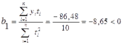 – линейный коэффициент регрессии, показывающий направление тренда, в данном случае b1