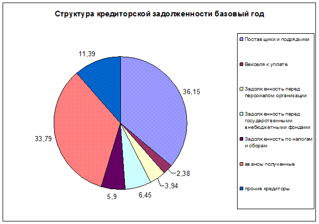 Диаграмма № 3 «Структура кредиторской задолженности на начало анализируемого периода» Проанализировав анализ структуры кредиторской задолженности на начало анализируемого периода видно, что удельный вес поставщиков и подрядчиков составил 36,15% (наибольший); удельный вес векселей к уплате составил 2,38%(наименьший); удельный вес задолженности перед персоналом организации составил 3,94%; удельный вес задолженности перед государственными внебюджетными фондами составил 6,45%; удельный вес задолженности по налогам и сборам составил 5,9%; удельный вес авансов полученных составил 33,79%; удельный вес прочих кредиторов составил 11,39%.