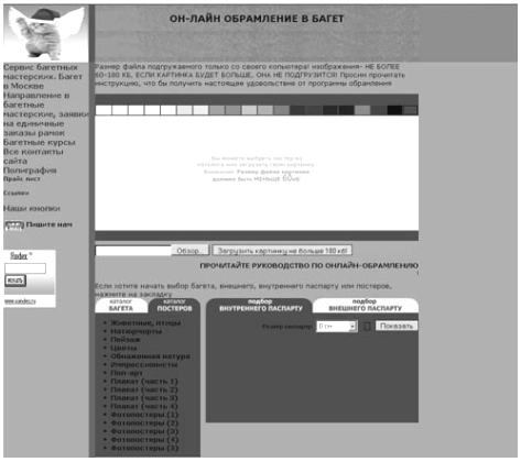 Рисунок 1.3 - Интернет сервис Он-лайн обрамление V.4 1.2.4 Программа Багетная мастерскаяДанная программа позволяет пользователю: 1. Оформить фотографии, постеры, гравюры различным багетом и паспарту. 2. Посмотреть, как могут преобразиться его изображения, не посещая багетную мастерскую. 3. Заказать оформление для картин в режиме он-лайн, не выходя из дома [13]. Пользователю предлагается пошагово выбрать цвет стен, багет, верхний паспарту, средний паспарту, нижний паспарту и стекло. Далее пользователь может посмотреть, как будет выглядеть его заказ. После этого производится расчет стоимости израсходованных материалов и общая стоимость оформленной работы.
