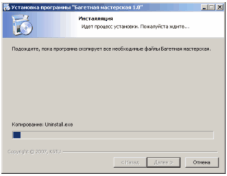7. Методическое обеспечениеРазработанная система представляет собой программу, предназначенную для автоматизации процесса принятия заказа и ведения складского учета расходуемых комплектующих и материалов в багетной мастерской. Система предназначена для: автоматизированного расчета стоимости выполнения заказа багетной мастерской; автоматизированного оформления бланка заказа, вывода его на печать; хранения информации о клиентах и их заказах; ведения автоматизированного складского учета расходуемых комплектующих и материалов; выдачи необходимых отчетов о расходе комплектующих и материалов. Система позволит повысить эффективность работы сотрудника багетной мастерской занимающегося принятием и расчетом стоимости заказов, а также облегчить организацию ведения складского учета расхода комплектующих и материалов управляющему мастерской. Внедрение данной системы позволит: значительно снизить трудоемкость и повысить производительность труда сотрудников мастерской; снизить вероятность ошибок при расчетах; повысить уровень сервиса, вследствие уменьшения времени, необходимого на обслуживание клиентов. 7.1 Руководство по установкеДля установки системы требуется 6,23 Мб свободного дискового пространства. Для нормальной работы системы потребуется около 40 Мб. Для того чтобы установить систему на компьютер необходимо запустить программу установки "setup. exe" с CD-диска, на котором поставляется система, либо предварительно скопировать её с CD-диска на жёсткий диск и запустить оттуда. На первом этапе установки вам будет предложено выбрать папку, в которую будет установлена программа. По умолчанию программа установки автоматически устанавливает программу на диске С по следующему пути: C: \Program Files\KSTU\Багетная мастерская. На следующем этапе вам будет предложено выбрать папку в меню "Пуск", куда будут помещены ярлыки устанавливаемой программы. По умолчанию создается папка "KSTU". Вы можете также отказаться от создания ярлыков, выбрав флажок "Не создавать ярлыки". Далее Вам будет предложено создать ярлык на рабочем столе. Вы можете отказаться от создания ярлыка, сняв флажок "Создать ярлык на рабочем столе". Далее необходимо следовать инструкциям, которые выдаёт программа установки. Процесс установки программы продемонстрирован на рисунках 7.1 - 7.7.