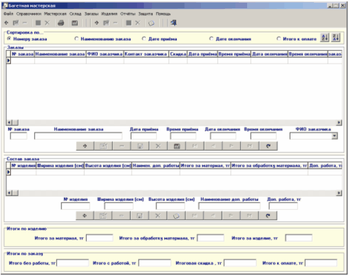 Рисунок 7.20 - Главное окно программы Для добавления нового заказа нажмите кнопку "Добавить заказ" Далее необходимо определить состав заказа. Для этих действий предназначена панель "Состав заказа". Для того чтобы добавить в заказ изделие нажмите кнопку "Добавить изделие" Далее необходимо определить состав изделия, для чего нужно нажать кнопку "Определить состав изделия"