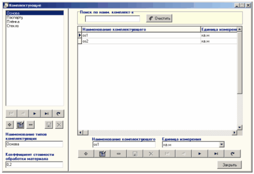 Рисунок 7.10 - Форма "Багеты" Для того чтобы изменить коэффициент стоимости обработки материала нажмите кнопку "Редактировать материал" Для добавления в справочник новой записи о багете нажмите кнопку "Добавить" Поле ввода "Поиск по наим. багета" в верхней части окна служит для поиска записи о каком-либо багете в том случае, если справочник уже содержит записи. Для осуществления поиска нужно набрать в данном поле наименование искомого багета. Кнопка "Очистить" 2) Заполните справочник "Комплектующие". В данный справочник вводится информация о материалах, расход которых измеряется в квадратных метрах. Выберите пункт "Комплектующие" меню "Справочники" для того, чтобы заполнить справочник используемых комплектующих. Для заполнения справочника Вам будет предложена следующая форма: