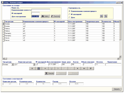 Рисунок 7.13 - Форма "Склад-Багеты" Чтобы добавить новую запись о каком-либо багете нажмите кнопку "Добавить" Панели "Поиск по…" и "Сортировка по…" служат для удобства просмотра записей, в случае если таблица "Склад-Багеты" уже содержит записи. Поиск осуществляется по наименованию комплектующего, № накладной и дате поступления. Для осуществления поиска заполните какое-нибудь из поисковых полей ввода и нажмите кнопку "Найти" Также можно воспользоваться панелью сортировки записей по наименованию комплектующего, № накладной и дате поступления. Для осуществления сортировки записей выберите нужный пункт и нажмите кнопку "Сортировать по возрастанию" Для заполнения таблицы "Склад-Комплектующие" выберите пункт "Комплектующие" меню "Склад". На экране монитора откроется форма "Склад-Комплектующие":