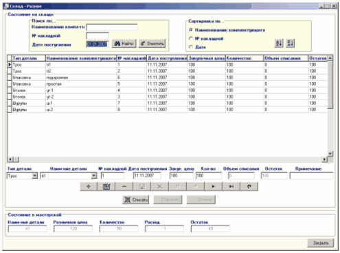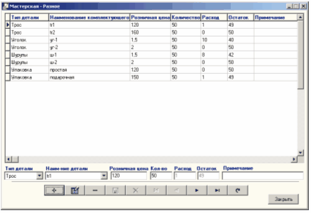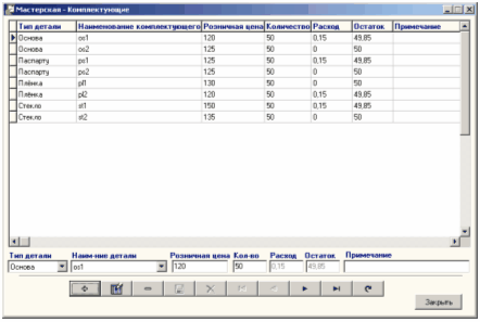 Рисунок 7.17 - Форма "Мастерская-Комплектующие" Работа с формой "Мастерская-Комплектующие" аналогична работе с формой "Мастерская-Багеты". Для заполнения таблицы "Мастерская-Разное" выберите пункт "Разное" меню "Мастерская". На экране монитора откроется форма "Мастерская-Разное":