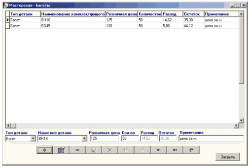 Рисунок 7.16 - Форма "Мастерская-Багеты" Чтобы добавить новую запись о каком-либо багете нажмите кнопку "Добавить" Для заполнения таблицы "Мастерская-Комплектующие" выберите пункт "Комплектующие" меню "Мастерская". На экране монитора откроется форма "Мастерская-Комплектующие":