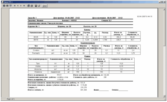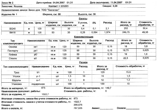 Рисунок 1.4 - Интернет сервис "Багетная мастерская" Подводя итог, можно сказать, что имеющиеся на сегодняшний день разработки в области компьютерных систем оформления заказа для багетной мастерской, обладая многими достоинствами, либо не совсем подходят по характеру решаемых заказчиком задач, либо являются недостаточно проработанными, грешат большим количеством ошибок и неудобством работы. Кроме того, существующие программные продукты, не совсем отвечая требованиям заказчика, как правило, стоят значительных сумм денег и их внедрение связано с риском их не окупаемости. Следует разработать такую систему, которая с одной стороны будет обладать надежностью, устойчивостью в работе, а с другой стороны будет успешно решать тот круг задач, который необходим для предприятия заказчика. 1.3 Постановка задачиЦелью данной работы является разработка системы автоматизированного учета для багетной мастерской. Основной задачей разрабатываемой системы является автоматизация процесса принятия заказа и ведения складского учета расходуемых комплектующих и материалов. В ходе выполнения проекта должны быть достигнуты следующие цели: программа должна удовлетворять требованиям заказчика; программа должна иметь простой, удобный и интуитивно понятный интерфейс; программа не должна содержать ошибок; программа должна позволять произвести быстрый расчет и оформление заказа с последующим выводом на печать результатов работы; в программе должно быть реализовано гибкое формирование состава заказа с возможностью добавления в заказ нескольких изделий; в программе должна быть реализована возможность изменения и корректировки заказа; работа со складом должна быть вынесена отдельно; программа должна содержать инструкцию по ее использованию, содержащуюся в файле помощи. Инсталляция программы должна осуществляться посредством установочного файла. Программа должна выполнять следующие функции: автоматизированный расчет стоимости выполнения заказа багетной мастерской; вести оперативный учет расхода комплектующих и материалов; оформление и вывод на печать бланка заказа; хранение информации о клиентах и их заказах; ведение учета расходуемых комплектующих и материалов; выдача необходимых отчетов о расходе комплектующих и материалов. 2. Техническое задание2.1 Общие сведения2.1.1 Наименование системы и условное обозначениеРазработке подлежит система автоматизированного учета для багетной мастерской. Система предназначена для автоматизации процесса принятия заказа и ведения складского учета расходуемых комплектующих и материалов. Условное обозначение системы "Багетная мастерская". 2.1.2 Разработчик и заказчикРазработчиком является студент Карагандинского государственного технического университета, факультета информационных технологий, группы САПР-02-2 Сулейманов Ринат Хамитович. Заказчиком является кафедра систем автоматизированного проектирования КарГТУ. 2.1.3 Основание для разработкиОснованием разработки является приказ на дипломное проектирование за номером 277с, выданный 12 марта 2007года кафедрой САПР. 2.1.4 Начало и окончание работСрок выполнения работ 23.06.2006 - 31.05.2007. 2.1.5 Порядок оформления и предъявления заказчику результатов работ по созданию системыРезультаты выполнения работы предъявляются заказчику в виде оформленной пояс