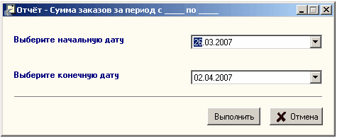 Рисунок 7.25 - Диалог выбора промежутка дат Требуется указать нужные даты, воспользовавшись соответствующими раскрывающимися списками, а затем нажать кнопку "Выполнить" Для предотвращения потери данных, рекомендуется ежедневно копировать базу данных. Для этого воспользуйтесь командой "Архивация базы" меню "Файл":