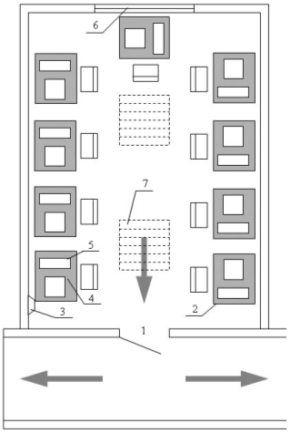 Рисунок 10.1 - Учебная аудитория 422 В аудитории имеется девять компьютерных столов 2, столы не приспособлены под компьютеры. При каждом столе находится обычный стул 7. Расстояния между стенами и столами 5см, что не соответствует СанПиН. Расстояние между соседними мониторами 1,2 м, что соответствует СанПиН. Компьютеры имеют два вентилятора, расположенных в системном блоке, размер экрана монитора 17 дюймов. В стене имеется две розетки 3. Компьютеры имеют заземление, проведённое в специальном кабеле, лежащем на полу. Отсутствует защитное зануление и отключение. На потолке установлены два светильника ЛПО 36 с зеркальными решётками, имеющих по четыре люминесцентных лампы (7), которые обеспечивают необходимую освещенность в аудитории. Освещённость на горизонтальной поверхности стола низкая, что подвергает дополнительной нагрузке зрение учащихся. Температура в аудитории 22°С (допустимая 20-24°С), относительная влажность воздуха не превышает 75%, что соответствует СанПиН. Из-за отсутствия эффективной системы вентиляции, воздух в помещении в летний и зимний период часто бывает тяжелым. В рассматриваемой аудитории площадь равна 6∙4=24 м2 , при количестве персональных компьютеров 9 шт. Это означает, что на один компьютер приходится 2,67 м2 , что не соответствует СанПиН. На основе выше изложенного можно сделать вывод, что помещение не в полной мере соответствует требованиям техники безопасности и СанПиН. 10.2 Расчет уровня шумаУровень шума в помещениях с персональными компьютерами не должны превышать допустимого, регламентированного в ГОСТ 12.2 003-83 "Шум. Общие требования безопасности". Уровень шума в помещениях ВЦ не должен превышать 50дБ. Источниками шума в помещении ВЦ являются: два вентилятора системного блока компьютера, с уровнем шума каждого 34 дБ; жёсткий дик системного блока компьютера, с уровнем шума 31 дБ; необходимые разговоры между работниками, с уровнем шума, от каждого человека 55 дБ; шум с улицы от окна на 2-ом этаже, уровень шума 40 дБ. Определим уровень шума от одного персонального компьютера, (работают два вентилятора и жесткий диск). Уровень шума от двух вентиляторов определяется по формуле (3.10) [21]: LСУМ =L1 +10∙lgn, (10.1) где L1 - уровень интенсивности звука одного источника, дБ; n - число источников; LСУМ =34+10∙lg2=37 дБ Рассмотри два вентилятора как один источник шума, и определим уровень шума с жёстким диском. Согласно формуле (3.11) [21] при одновременном действии двух источников с различными уровнями L1 и L2 суммарный уровень равен: LСУМ =L1 +∆L, (10.2) где L1 - больший из двух суммируемых уровней, дБ; (2 вентилятора 37дБ); ∆L - добавка к L1 , дБ; ∆L определяется по шкале для сложения уровней звукового давления, согласно которой необходимо определить разность уровней шума от разных источников, и по шкале сопоставить соответствующее значение ∆L. Разность уровней шума от вентилятора и жёсткого диска составляет 37-31=6 дБ. Тогда по шкале определим ∆L=0,98 дБ. Подставив данные в (10.1) определим суммарный уровень шума от одного вентилятора и жёсткого диска ПК: LСУМ =37+0,98=37,98 дБ. Определим суммарный общий уровень шума от работы ПК и разговоров людей в помещении, по формуле [21]: LСУМ ОБ
