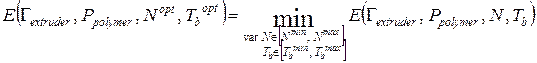Для заданных геометрических параметров одношнекового экструдера с плоскощелевой головкой Gextruder и характеристик полипропилена Ppolymer по математической модели процесса экструзии определить оптимальные значения частоты вращения шнека Nopt Î [Nmin , Nmax ] и температуры корпуса Tb opt Î [Tb min , Tb max ], которые обеспечивают минимум энергопотребления экструдера