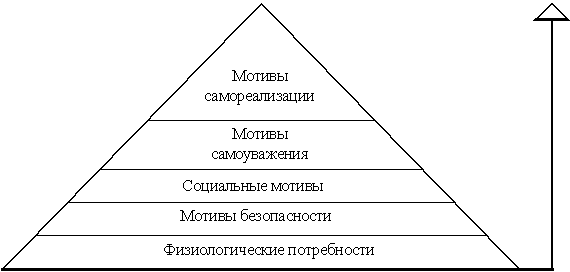 Рис.2. Пути удовлетворения потребностей по Маслоу Смысл такого иерархического построения заключается в том, что приоритетны для человека потребности более низких уровней и это сказывается на его мотивации. Другими словами, в поведении человека более определяющим является удовлетворение потребностей сначала низких уровней, а затем, по мере удовлетворения этих потребностей, становятся стимулирующим фактором и потребности более высоких уровней. Самая высокая потребность - потребность самовыражения и роста человека как личности - никогда не может быть удовлетворена полностью, поэтому процесс мотивации человека через потребности бесконечен. Долг руководителя заключается в том, чтобы тщательно наблюдать за своими подчиненными, своевременно выяснять, какие активные потребности движут каждым из них, и принимать решения по их реализации с целью повышения эффективности работы сотрудников. 1.2 Физиологические потребностиПри выделении физиологических потребностей Маслоу опирается на концепцию гомеостаза, суть которой состоит в том, что организм совершает определенные действия, направленные на поддержание определенного внутреннего постоянства. Это постоянство связано, например, с необходимостью поддержания солевого, белкового, кислотно-щелочного балансов, а также с постоянством температуры тела. Этот список можно, безусловно, продолжить, вспомнив о гормонах, витаминах и т.д. Таким образом, физиологические потребности связаны с удовлетворением потребности в пище, воде, с поддержанием температурного баланса, удовлетворением сексуальных потребностей. По мнению автора теории, физиологические потребности — самые мощные, самые насущные из всех потребностей, и до тех пор, пока они не удовлетворены, потребности более высокого уровня, социальные потребности, как правило, не будут актуализированы. 1.3 Потребность в безопасностиПосле удовлетворения физиологических потребностей на первый план выходит потребность в безопасности. Потребность в безопасности — это свобода от страха, тревоги и хаоса; это потребность в стабильности и защите; в структуре, порядке, законе. Актуализация потребности в безопасности, ее доминирование на конкретном этапе означает, что именно удовлетворению этой потребности будет подчинено все поведение личности. Также как и в случае с физиологическими потребностями, здесь можно сказать, что все будет инструментом обеспечения безопасности: ум, память и все прочие способности будут направлены на достижение этой цели. 1.4 Потребность в принадлежности и любвиПосле того как удовлетворены потребности двух предыдущих уровней, актуализируется потребность в принадлежности, любви, привязанности. Она включает в себя стремление к общению, принадлежности к социальной группе, желание дружеских отношений и любви. Существует мнение, что стремительное развитие «групп встреч» и других групп личностного роста как метода психологической помощи современному «цивилизованному» человеку, связано с неутоленной жаждой искреннего, открытого общения, с потребностью в близости, в принадлежности, со стремлением преодолеть чувство одиночества и изоляции, преодолеть утрату глубины понятия «дружба». 1.5 Потребность в признанииЭта потребность включает в себя как желания и стремления, связанные с понятием «достижение» (рост 
