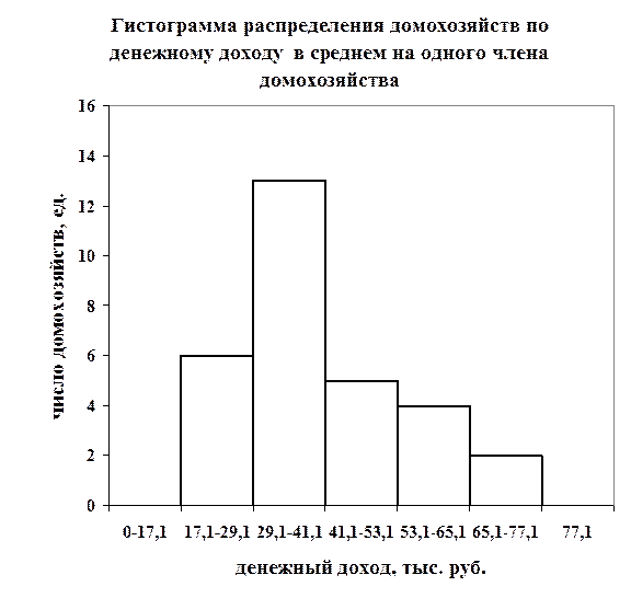 Вывод. Анализ интервального ряда распределения изучаемой совокупности домохозяйств показывает, что распределение домохозяйств по денежному доходу в среднем на одного члена домохозяйства не является равномерным: преобладают домохозяйства по денежному доходу в среднем на одного члена домохозяйства от 29,1 тыс. руб. до 49,1 тыс. руб. (это 13 домохозяйств, доля которых составляет 43,3%); самые малочисленные группы домохозяйств, доход которых в среднем на одного члена домохозяйства составляет 65,1-77,1 тыс. руб. и 53,1-65,1 тыс. руб. Эти группы включают соответственно 2 и 4 домохозяйства, что составляет 6,7% и 13,3% от общего числа домохозяйств. 2. Нахождение моды и медианы полученного интервального ряда распределения графическим методом и путем расчетов Для определения моды графическим методом строим по данным табл. 4 (графы 2 и 3) гистограмму распределения домохозяйств по изучаемому признаку.