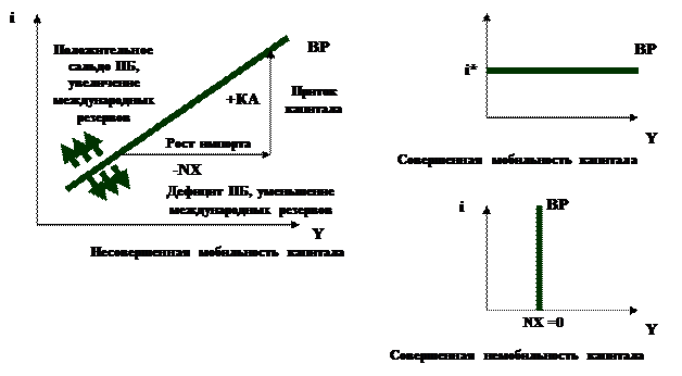 Равновесие ПБ ( I - S ) + ( X – М) = 0 = ВР (укороченная запись равновесия ПБ) • данная запись показывает связь между международными потоками средств, предназначенных для накопления капитала и международными потоками товаров и услуг • равновесие ПБ достигается, когда правительство не увеличивает и не теряет официальные резервы, т.е. когда баланс официального резервного счета равен нулю Ситуации равновесия ПБ: • если (I - S) положительна, a (X – M) - отрицательна, имеется активное сальдо движения капитала и дефицит текущего счета ПБ, страна берет займы на мировых финансовых рынках и импортирует больше товаров, чем экспортирует • если (I - S) отрицательна, a (X – M) — положительна, имеется дефицит счета движения капитала и активное сальдо счета текущих операций, на мировых финансовых рынках страна является кредитором и больше экспортирует товаров, чем импортирует ( I - S ) + ( X – М) + OR = 0 (полная запись равновесия ПБ) , где • OR - счет движения золотовалютных (официальных) резервов Равновесие ПБ (графическое представление) BP «Balance of Payments»: NX (Y, Y*, r*) + KA (i - i*) = 0 баланс текущего счета + баланс счета движения капитала = 0 BP – график внешнего баланса (ПБ)