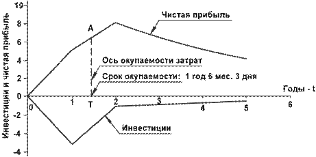 1 Компаундирование – приведение сегодняшних затрат к будущему моменту времени. Дисконтирование – приведение будущих затрат к сегодняшнему (настоящему) времени. Срок окупаемости, по данным табл. П10, определится как Токд = r * Σинв / Σп = 5*8,46/28,8 = 1,47 года Более наглядно дает вычисление Токд с применением графика (рис. 3).