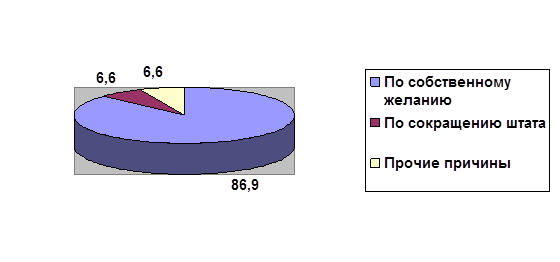 1.2 Движение кадров с начала года 2.1. С начала года в СЖА было принято 9 человек переводом с других железнодорожных предприятий и 1 человек временно отрабатывал практику. 2.2. Уволено было 61 человек, из них: 53 чел. - по собственному желанию (в т.ч. 38 чел. на пенсию), 8 чел. - переведены в другие структурные подразделения, из них 4чел. -по сокращению штата, 4чел. – по прочим причинам. Можно сделать вывод, что основная причина увольнений – по собственному желанию (86,8%) из них 62,3% - выход на пенсию. Уровень текучести 4,9% считается приемлемым для данной организации, способствует своевременному обновлению коллектива и не требует особых мер со стороны руководства и кадровой службы. Рис. 1.- График причин увольнений в СЖА по обслуживанию пассажиров,