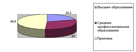 1.3.2 Образовательная номенклатура Из 1237 чел. Высшее образование имеют 250 чел (20,2%), в т.ч. базовое высшее образование – 182 чел. (14,7%). Среднее профессиональное образование имеют 383 чел. (31%), в т.ч. базовое среднее профессиональное образование – 232 чел. (18,8%). Практики – 604 чел. (48,8%). Рис. 3 – Кадровый состав СЖА по обслуживанию пассажиров по образовательной номенклатуре,%