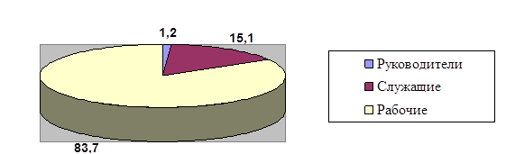 1.3.3 Профессиональная номенклатура Из 1237 чел., работающих в СЖА по обслуживанию пассажиров 15 чел. (1,2%) занимают должности руководителей, 187 чел.(15,1%) – служащие и 1035 чел. (83,7%) – рабочие. Можно сделать вывод, что в СЖА рабочих должностей намного больше, чем должностей руководителей и служащих, что соответствует содержанию деятельности и выполняемым функциям. Рис.4 – Кадровый состав СЖА по профессиональной номенклатуре,%