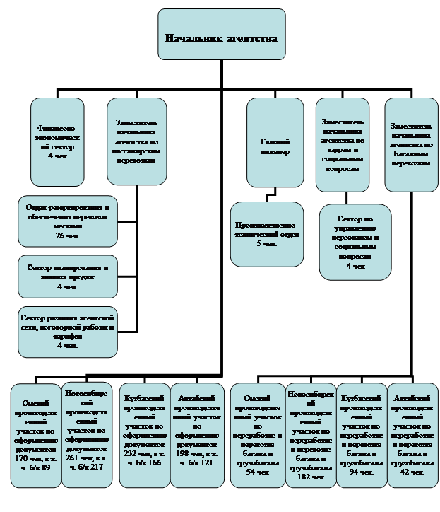 | Введение В июле 2009 года мы проходили производственную (организационно управленческую) практику в Сибирском железнодорожном агентстве по обслуживанию пассажиров структурного подразделения Западно-Сибирской региональной дирекции по обслуживанию пассажиров – структурного подразделения Федеральной пассажирской дирекции – филиала открытого акционерного общества «Российские железные дороги». Основными задачами Агентства являются: а) организация и осуществление продажи проездных и перевозочных документов в соответствии с требованиями корпоративных стандартов, оказание дополнительных услуг, организация и осуществление продажи перевозочных документов на багаж, грузобагаж, почту и оказание, связанных с этим, дополнительных услуг; б) обеспечение и контроль соблюдения установленных норм и правил реализации проездных и перевозочных документов; в) развитие подсобно-вспомогательной деятельности, повышение доходности пассажирских перевозок дальнего следования; Агентство при выполнении основных задач, осуществляет следующие виды деятельности: а) оформление перевозки пассажиров, багажа и грузобагажа, в том числе почты железнодорожным транспортом общего пользования по территории Российской Федерации и в международном сообщении; б) текущее содержание зданий и помещений, закрепленных за Агентством, содержание в исправном состоянии терминального оборудования АСУ «Экспресс»; в) организация и развитие деятельности по добровольному страхованию пассажиров и багажа. Подготовка актов сверки взаиморасчетов, учет средств резерва предупредительных мероприятий; г) техническое обучение билетных и багажных кассиров порядку оформления проездных документов и получению справочной информации согласно инструкции по работе билетных и багажных кассиров на терминальном оборудовании АСУ «Экспресс», участие в разработке универсальных программ обучения билетных и багажных кассиров; д) прием, регистрация, рассмотрение, расследование обращений и жалоб пассажиров на работу билетных касс и багажных отделений, подготовка квалифицированных ответов на них, ежемесячный анализ и подготовка отчета по рассмотрению указанных жалоб и обращений; е) обеспечение взаимодействия со структурными подразделениями ОАО "РЖД" по организации оформления проездных и перевозочных документов воинских эшелонов, специального контингента и специальных вагонов; ж) присвоение в установленном порядке видов работ, признаков и технологических резервов билетно-кассовым, технологическим и справочным терминалам; з) организация и оформление групповых и туристических перевозок; и) установление оптимальных режимов работы билетных касс и касс багажных отделений; к) формирование заявок по плану информатизации, заказа терминального оборудования, билетопечатающих устройств, автоматизированных рабочих мест и технических обустройств для бесперебойной работы билетных, багажных касс и технологических подразделений Дирекции; л) разработка регламента взаимодействия технического персонала по обеспечению бесперебойной работы пунктов продажи; м) обеспечение пунктов продаж техническими средствами пожарной безопасности и охранной сигнализации; н) применение в Агентстве нормативов и стандартов по охране труда, проведение аттестации рабочих мест; о) подготовка 