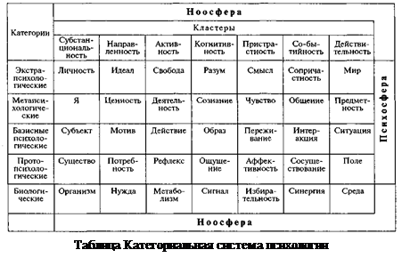 В свое время в поисках отграничения специфической предметной области психологии Н.Н. Ланге ввел понятие «психосфера», призванное охватить богатство и многоплановость феноменов этой науки. При соотнесении представления Н.Н. Ланге о психосфере с фундаментальными идеями В.И. Вернадского о биосфере и ноосфере возникает перспектива понять и описать подлинное место психосферы в едином пространстве, образуемом природой и социумом. По В.И. Вернадскому, биосфера представляет собой активную оболочку Земли, в которой совокупная деятельность живых организмов (в том числе человека) проявляется как фактор планетарного масштаба и значения. В.И. Вернадский вслед за Э. Леруа и П. Тейяром де Шарденом понимает ноосферу как новое эволюционное состояние биосферы, при котором разумная деятельность человека становится решающим фактором развития первой. Для ноосферы характерна тесная взаимосвязь законов природы с законами мышления и общества. Отсюда очевидно, что психосфера (сохраняя собственную уникальную предметность) интегрирует в превращенном виде процессы, совершающиеся в биосфере и ноосфере, тяготея в одних случаях к первой, в других – ко второй. Сказанное позволяет при исследовании базисных и метапсихологических категорий обратиться и к пространству биосферы, в недрах которой сложились протопсихологические категории, сущностно проявляющиеся в базисном категориальном строе психологии. Вместе с тем уровень метапсихологических категорий содержит сущностные характеристики по отношению к экстрапсихологической категориальной развертке, детерминированной специфическими характеристиками ноосферы. Отсюда следует, что, к примеру, «потребность» (протопсихологическая категория) выступает как сущность, а «мотив» (базисная категория) – как явление, в котором эта сущность обнаруживается. В свою очередь «ценность» (метапсихологическая категория) проявляется в «идеале» – категории экстрапсихологической. Итак, мы можем представить себе категориальную систему психологического познания как своего рода сетку, образующую пять уровней категорий (из которых первая не является собственно психологической, но остается сущностной по отношению к вышележащим психологическим категориям): биологические, протопсихологические, базисные психологические, метапсихологические и экстрапсихологические, охватывающие в целом всю психосферу и порождающие весь понятийный аппарат психологической науки. Например, условная вертикаль «нужда – потребность – мотив – ценность – идеал» включает величайшее множество психологических понятий (влечения, желания, интерес, склонность, ценностные ориентации и т.д.). Приводимая таблица достаточно полно характеризует категориальную систему психологии. Могут быть специфицированы как «параллели» (плеяды), так и «меридианы» (кластеры) категорий, которые упорядочены в приведенной таблице. Характеризуя плеяды категорий, мы выскажем здесь всего два суждения, которые требуют специального обоснования. 1. Каждая из категорий любой из строк при всей своей специфичности неотделима от каждой другой категории той же строки (например, категория «Я» из плеяды метапсихологических категорий немыслима вне соотношения с категориями «ценность», «деятельность», «чувство», «сознание», «общение», «предметность», а категори