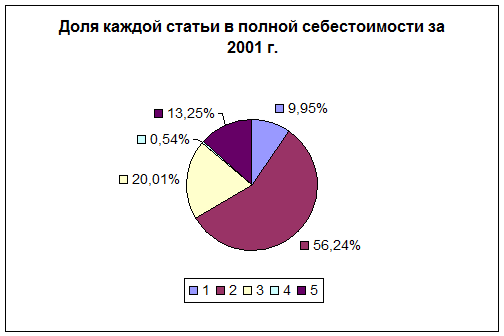 Рис. 10. Структура себестоимости 2002 года. Важное значение имеет также показатель затрат на единицу продукции, он определяется отношением полной себестоимости к объему производства продукции и делением на 12 месяцев. Для данного предприятия калькуляционная единица – 1 кв. м. обслуживаемой площади. С каждым годом затраты растут, что видно из таблицы 5. Таблица 5. Затраты на единицу продукции.