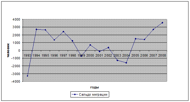 Томская область относится к числу российских регионов, в которых многолетняя (начиная с 1992 года) естественная убыль населения частично компенсируется миграционными приростами [2]. Динамика миграции населения Томской области с 1993 г. по 2008 г. отмечается нестабильным характером. На рисунке 3.1 изображена динамика миграционного прироста (-убыли) в Томской области за последние шестнадцать лет. На миграцию населения безусловно влияет социально-экономическое положение региона, уровень безработицы, также уровень жизни и т.д., общая ситуация в стране. Важно, каким является регион, многофункциональным или же монофункциональным. В Томской области активно развивается добыча полезных ископаемых, город Томск является «городом студентов», также развита производство. Эти факторы положительно влияют на увеличения миграционного прироста в регионе.