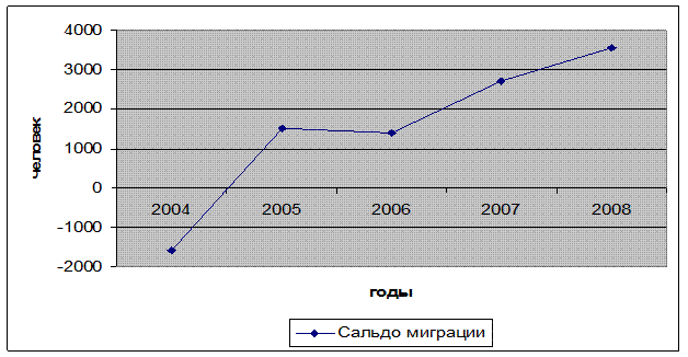 в случае результативного обмена значение коэффициента должно быть меньше 1000. В нашем случае прибывшие превышают выбывших, то есть обмен результативен. Интенсивность миграции рассчитаем по формуле (2.2). Количество мигрантов в сумме равно 179947 человек, а средняя за период численность населения равна 1034075 человек. Таким образом, Рассчитаем миграционное сальдо по имеющимся данным в таблице 3.1. Формула расчета сальдо миграции была охарактеризована в теоретической части данной работы (2.3). В 2008 году в Томской области прибыло 20745, а выбыло 17177 мигрантов. Сальдо составил 3568 человек. Заполним таблицу 3.2 и на ее основе построим график динамики сальдо миграции с 2004-2008 гг. График изображен на рисунке 3.2. Таблица 3.2 Сальдо миграции (2004 - 2008)