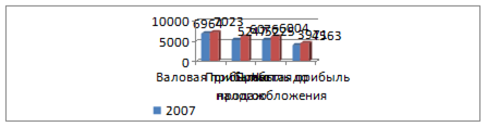 Исходя из вышеприведенных данных, могут быть сделаны следующий предварительный вывод: общая себестоимость реализованных предприятием товаров, продукции, работ и услуг прирастает большими темпами, нежели чем идет прирост выручки (108,54% > 107,23%). 3) Валовая прибыль равна разнице между суммами, указанными по строке 010 и по строке 020 формы № 2, т.е. между выручкой и себестоимостью. Валовая прибыль предприятия в абсолютном значении увеличилась на 59 тыс. руб. (темп роста – 100,85%), хотя ее удельный вес в выручке снизился (на 1,01%). 4) Управленческие расходы ООО «Теплострой» за 2008г. снизились по сравнению с 2007г. на 770 тыс. руб. (темп роста – 55,15%); их удельный вес в сумме выручки предприятия снизился на 2,04%. 5) По строке 050 «Прибыль (убыток) от продаж» указывается финансовый результат от продажи продукции (товаров, работ, услуг), который определяется так: Строка 050 = Строка 010 - Строка 020 - Строка 030 - Строка 040. В 2008г. сумма прибыли предприятия по сравнению с предшествующим годом возросла по абсолютному значению на 829 тыс. руб. (на 21,60%), удельный вес данного показателя в выручке также возрос на 1,03%. 6) Всего «Прочие расходы» ООО «Теплострой» за 2008г. увеличились по сравнению с предшествующим годом на 50 тыс. руб. (удельный вес в выручке возрос на 0,11%; темп роста показателя – 327,27%). 7) По строке 140 формы № 2 «Прибыль (убыток) до налогообложения» показывается бухгалтерская прибыль (убыток) до налогообложения. В отчетном периоде (2008г.) предприятием получена прибыль в размере 6004 тыс. руб., что на 779 тыс. руб. (или на 14,91%) больше, чем за 2007г. 8) По строке 150 Отчета о прибылях и убытках «Текущий налог на прибыль» нужно показать сумму текущего налога на прибыль, то есть сумму налога на прибыль за отчетный год, которую нужно уплатить. Эту сумму можно было бы определить из декларации по налогу на прибыль за отчетный год, однако пункт 21 Положения по бухгалтерскому учету "Учет расчетов по налогу на прибыль" (ПБУ 18/02) требует рассчитывать текущий налог на прибыль по данным бухучета. Всего текущий налог на прибыль за 2008г. составил 1441 тыс. руб., что на 592 тыс. руб. больше, чем за 2007г. Рост суммы налога связан с ростом налогооблагаемой базы (прибыли до налогообложения). 9) По строке «Чистая прибыль (убыток) отчетного периода» показывается чистая прибыль (убыток) отчетного года. Эту строку можно заполнить на основании данных Отчета о прибылях и убытках: Строка 190 = Строка 140 "Прибыль (убыток) до налогообложения" + Строка 141 "Отложенные налоговые активы" - Строка 142 "Отложенные налоговые обязательства" - Строка 150 "Текущий налог на прибыль". Поскольку, как уже было отмечено выше, отложенные налоговые активы и обязательства ООО «Теплострой» в отчетности не показываются, чистая прибыль (убыток) отчетного периода исчисляется как разница строк 140 и 150 Отчета о прибылях и убытках. За 2008г. чистая прибыль ООО «Теплострой» составила 4563 тыс. руб., что на 592 тыс. руб. (или на 14,91%) больше, чем за 2007г. Удельный вес чистой прибыли предприятия в выручке возрос на 0,69% и составил в отчетном периоде 10,43%. Динамика основных показателей финансовых результатов ООО «Теплострой» представлена на рис. 2.2. Как наглядно видно из данной диаграммы, все показатели, характеризующие финансовые результаты деятельности ООО «Теплострой» в 2008 году выше полученных в 2007 году, что положительно характеризует деятельность предприятия в анализируемом перио