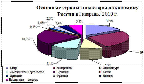 В общем объеме иностранных инвестиций, поступивших в российскую экономику в I квартале, более 50% пришлось на Нидерланды (2,5 млрд. долларов), Германию (2,1 млрд. долларов), Кипр (1,4 млрд. долларов), Великобританию (1,1 млрд. долларов). При этом значительную часть средств Нидерланды направили в связь (41%) и добычу топливно-энергетических полезных ископаемых (31,8%); Германия – в добычу топливно-энергетических полезных ископаемых (38%) и обрабатывающее производство (35,3%); Кипр – в операции с недвижимым имуществом, аренду и предоставление услуг (17,4%), в добычу полезных ископаемых (15,5%), в оптовую и розничную торговлю (11,4%) и финансовую деятельность (11,1%); Великобритания – в обрабатывающее производство (59,7%) и связь (18,3 процента). Рис. 2.2