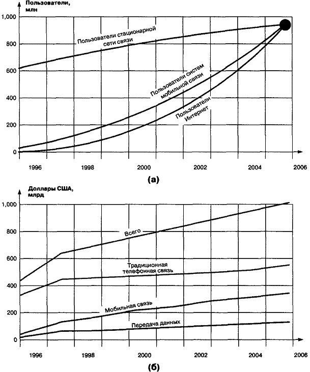 Рис. 1.1. Рост трафика Интернет (данные) и телефонного трафика Но понятие Voice over IP подразумевает не только и не столько использование сети Интернет в качестве среды передачи речи, сколько сам протокол IP и технологии, обеспечивающие надежную и высококачественную передачу речевой информации в сетях пакетной коммутации. Отсутствие гарантированного качества обслуживания при передаче речи компенсируется появлением таких технологий, как многопротокольная коммутация по меткам — Multiprotocol Label Switching (MPLS), протокол резервирования ресурсов — Resource Reservation Protocol (RSVP), дифференциальное обслуживание разнотипного трафика — Differentiated Services (DiffServ) и других. Все большую популярность приобретает передача пакетов IP, упакованных в контейнеры систем синхронной цифровой иерархии — Synchronous Digital Hierarchy (SDH), а также технология спектрального мультиплексирования — Wave Division Multiplexing (WDM). Во всех случаях необходимым условием является подчинение каждого узла системы единой политике управления трафиком. Этому же призваны помочь протоколы RTP, RTSP, Diffentiaten Services и другие механизмы, рассматриваемые в следующих главах книги. Здесь же достаточно отметить, что стандартизация речевых технологий на основе стека TCP/IP и их поддержка лидерами рынка пакетной телефонии обеспечат совместимость оборудования разных производителей и позволят создавать системы, в которых возможны вызовы с аналогового телефонного аппарата, подключенного к порту маршрутизатора, на персональный компьютер, или с персонального компьютера на номер ТфОП, в рамках трех сценариев IP-телефонии, рассматриваемых в следующей главе. 1.2. Перспективы развития ТфОП и IP-сетейПродолжая анализ роста трафика данных и речи, представленного в виде графиков на рис.1 в предыдущем параграфе , авторы позволили себе привести прогноз роста количества абонентов (графики на рис.1.2а). Суть прогноза отнюдь не в том, что количество пользователей сетей стационарной связи, мобильной связи и Интернет к 2004-2006 годам достигнет миллиарда, а в том, что емкости этих сетей сближаются. В контексте данной главы последнее обстоятельство, согласно закону диалектики о переходе количества в качество, приводит к принципиально новым мыслям по поводу конвергенции этих сетей. Немаловажным стимулом таких мыслей является прогноз общемировых доходов от телекоммуникационных услуг, сделанный Dataquest (рис. 1.26), графическое представление которого почти совпадает с верхней кривой на рис. 1.2а. Пороговая величина в этом прогнозе составляет триллион долларов США совокупного дохода по сегментам рынка (речь, данные, мобильная связь), а переход за этот порог ожидается еще раньше — в 2002-2003 гг.