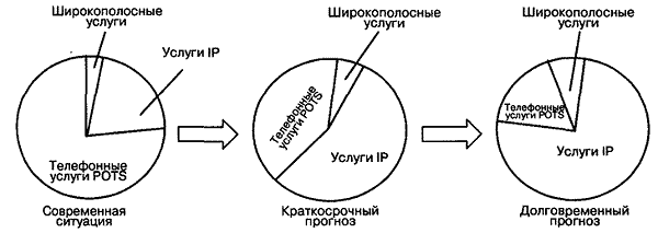 Рис. 1.3 . Тенденции развития телекоммуникационных услуг Первоочередная цель конвергенции сетей на базе протокола IP — это снижение общих расходов, складывающихся не только из капитальных затрат на приобретение и инсталляцию телекоммуникационного оборудования, но и из затрат на его содержание. Теоретически одна объединенная сеть уменьшила бы потребность в квалифицированном персонале — одни и те же люди стали бы заниматься и телефонией, и системами передачи данных. Наличие всего одного канала доступа к распределенной сети тоже основательно снизило бы ежемесячные расходы. Направляя речевой трафик через корпоративную магистральную сеть передачи данных, можно существенно уменьшить затраты на традиционные телефонные услуги. И, наконец, сокращение единиц используемого оборудования значительно уменьшит стоимость его технического обслуживания. Как отметил представитель одного международного оператора связи, переход на технологию IP-телефонии позволит ему сэкономить порядка 70% средств на капитальные затраты, 60–80% средств, выделяемых на организацию каналов доступа, и 50% средств на текущее обслуживание и ремонт сети [13]. Однако экономия на стоимости инфраструктуры — это не то, ради чего замышлялся переход к объединенным сетям. Революция произойдет тогда, когда появятся новые приложения, например, когда центры обслуживания клиентов смогут в реальном времени «сопровождать» каждого покупателя с момента его появления на домашней странице компании в сети Интернет до оформления заказа на покупку нужного продукта, «проводя» его через такие этапы, как демонстрация каталога предлагаемых изделий и выяснение неясных вопросов в ходе телефонного общения с представителем компании. Другой пример применения новых технологий — использование сотрудниками телефонного сервиса своей корпоративной УАТС независимо от того, где он и находятся, например, при работе дома. Кэтим применениям IP-телефонии авторы вернутся в главе 11. При всех оптимистических прогнозах, изложенных выше, не следует забывать, что традиционная телефонная связь опирается на мощную базу, создававшуюся на протяжении многих десятилетий, и такая система не может не обладать определенной инерцией. Исходя из этого, вряд ли стоит ожидать, что не сегодня-завтра произойдет мгновенный революционный скачок в области связи, и Интернет-телефония вытеснит все остальные технологии. Скорее наоборот: на протяжении ближайших 5-10 лет традиционная телефония будет по-прежнему занимать доминирующие позиции. Переход на новые, более прогрессивные методы будет происходить постепенно эволюционным путем, в разных странах с разной скоростью. А это значит, что в течение длительного времени ТфОП и IP-сети будут вынуждены существовать параллельно, обеспечивая взаимную прозрачность и объединяя свои усилия в обслуживании разнородного абонентского трафика. Согласно известной формуле о невозможности находиться в каком-то обществе и быть вне его законов, при вхождении IP-телефонии в давно сформировавшееся глобальное телефонное общество необходимо соблюдение основных законов существующей ТфОП: эксплуатационная надежность с тремя девятками после запятой, жесткие нормы качества передачи речи в реальном времени и т.п. Не менее законов, правил и норм важны традиции, сформировавшиеся за более ч