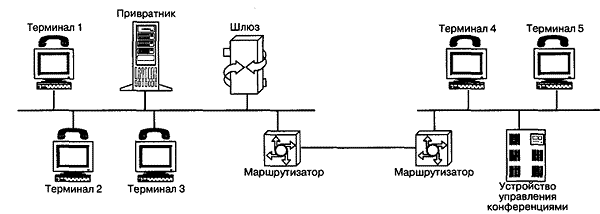 Рис. 1.7. Виды конференции в сетях H.323 Преимуществом централизованной конференции является сравнительно простое терминальное оборудование, недостатком — большая стоимость устройства управления конференциями. Для децентрализованной конференции требуется более сложное терминальное оборудование и желательно, чтобы в сети IP поддерживалась передача пакетов IP в режиме многоадресной рассылки (IP multicasting). Если этот режим в сети не поддерживается, терминал должен передавать речевую информацию каждому из остальных участников конференции в режиме точка-точка. Устройство управления конференциями состоит из одного обязательного элемента-контроллера конференций (Multipoint Controller — МС), и, кроме того, может включать в себя один или более процессоров для обработки пользовательской информации (Multipoint Processor — МР). Контроллер может быть физически совмещен с привратником, шлюзом или устройством управления конференциями, а последнее, в свою очередь, может быть совмещено со шлюзом или привратником. Контроллер конференций используется для организации конференции любого вида. Он организует обмен между участниками конференции данными о режимах, поддерживаемых их терминалами, и указывает, в каком режиме участники конференции могут передавать информацию, причем в ходе конференции этот режим может изменяться, например, при подключении к ней нового участника. Так как контроллеров в сети может быть несколько, для каждой вновь создаваемой конференции должна быть проведена специальная процедура выявления того контроллера, который будет управлять данной конференцией. Существует еще один элемент сети H.323 — прокси-сервер H.323, т.е. сервер-посредник. Этот сервер функционирует на прикладном уровне и может проверять пакеты с информацией, которой обмениваются два приложения. Прокси-сервер может определять, с каким приложением (H.323 или другим) ассоциирован вызов, и осуществлять нужное соединение. Прокси-сервер выполняет следующие ключевые функции: