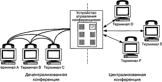 В одной сети IP-телефонии, отвечающей требованиям рекомендации ITU H.323, может находиться несколько привратников, взаимодействующих друг с другом по протоколу RAS. Кроме основных функций, определенных рекомендацией H.323, привратник может отвечать за аутентификацию пользователей и начисление платы (биллинг) за телефонные соединения. Устройство управления конференциями обеспечивает возможность организации связи между тремя или более участниками. Рекомендация H.323 предусматривает три вида конференции (рис. 1.7): централизованная (т.е. управляемая MCU, с которым каждый участник конференции соединяется в режиме точка-точка), децентрализованная (когда каждый участник конференции соединяется с остальными ее участниками в режиме точка-группа точек) и смешанная.