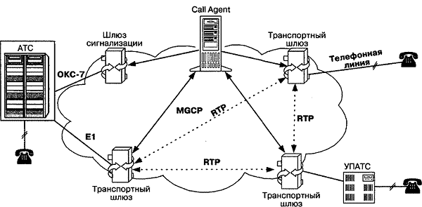 Существует также и бессерверный вариант соединения, когда один терминал может передать запрос другому терминалу непосредственно. Дадим краткую характеристику самого протокола SIP. Следует заметить, что сообщения SIP могут переноситься как протоколом TCP, так и протоколом UDP. Протокол SIP предусматривает 6 запросов и ответов на них. Сигнализация SIP дает возможность пользовательским агентам и сетевым серверам определять местоположение, выдавать запросы и управлять соединениями. Более подробная информация о протоколе SIP приведена в главе 7. 1.5.3. Сеть на базе MGCP и MEGACOТретий подход к построению сетей IP-телефонии, основанный на использовании протокола MGCP [56], также предложен комитетом IETF, рабочей группой MEGACO. При разработке этого протокола рабочая группа MEGACO опиралась на сетевую архитектуру, содержащую основные функциональные блоки трех видов (рис. 1.12):