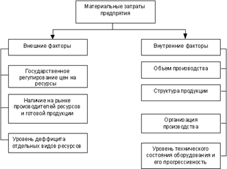 3.2. Система факторов, влияющих на сумму материальных Анализ практики хозяйствования показывает, что на сумму материальных затрат влияет множество факторов внешней и внутренней среды предприятия, основные из них показаны на схеме, приведенной ниже (рис.2). Государственное регулирование цен на материальные ресурсы в зависимости от политики ценообразования может по разному оказывать влияние на сумму материальных затрат конкретного предприятия. Например, в настоящее время в Украине до сих пор не решен вопрос с поставками такого дорогостоящего сырья как природный газ. Цены, устанавливаемые государством значительно выше тех, по которым реально по договоренности между предприятиями поставщиками и предприятиями производителями природный газ может приобретаться последними. Увеличение на рынке производителей готовой продукции обусловливает рост конкуренции на рынке материальных ресурсов, ужесточение борьбы за более дешевые сырьевые рынки. Рост объемов производства и потребления материальных ресурсов вызывает дефицит отдельных видов ресурсов, что влечет за собой повышение их цены, а значит увеличение себестоимости продукции производителя. Большая часть материальных затрат как правило является переменными поэтому с ростом объемов производства их сумма увеличивается, а с уменьшением – снижается. |