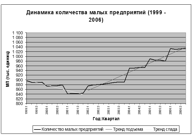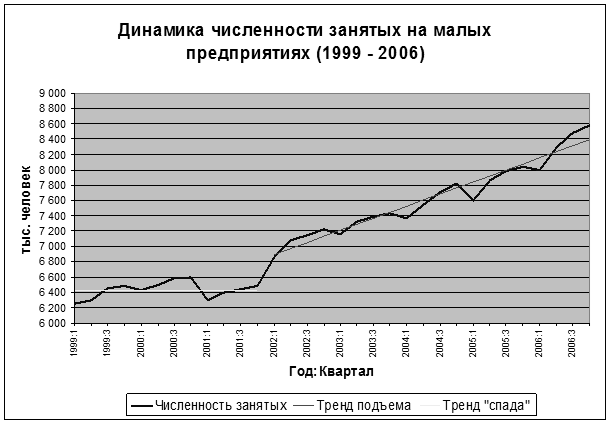 Визуальный анализ графика позволяет констатировать рост количества малых предприятий, начиная с 2002 года, до этого момента (с 1998 по 2001 гг.) наблюдалось медленное сокращение их количества, что позволяет разделить исследуемый промежуток времени на два соответствующих периода: 1) Период спада (1998 – 2001 гг.), 2) Период подъема (2002 – 2006 гг.). Кроме этого, очевидным является факт сезонности: данные свидетельствуют о том, что в 1-ом квартале каждого нового года количество малых предприятий меняется существенно по сравнению с изменениями в течение года. Другими словами, основная волна регистрации/ликвидации малых предприятий приходится на начало года, а уже впоследствии происходят обычные рыночные подстройки, определяющие годовую динамику. При этом в 2003 году количество малых предприятий почти не изменилось по сравнению с 2002 годом, что немного нарушает общую тенденцию скачкообразного роста малых предприятий в период подъема. Эконометрический анализ динамики позволяет получить достаточно точные количественные оценки и, в частности, обосновать указанное выделение двух периодов в развитии малого предпринимательства. Чтобы отследить полную картину развития малого предпринимательства построим график 2 занятости населения а малом бизнесе. График 2