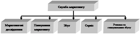 Рис. 1.1 Алгоритм формування маркетингової організаційної структури [16]. На першому етапі проводиться дослідження ринку, на якому працює товариство: визначається величина попиту і пропонування продукції, співвідношення між ними, реальна і потенційна місткість ринку та його сегментів, стан конкуренції, аналізується поведінка споживачів, тенденції та перспективи розвитку ринку тощо. У процесі дослідження ринку необхідно знайти відповіді на такі основні запитання: - Яким є ринок даного продукту в цілому? - Хто є основними споживачами продукту бізнесу? - Де знаходиться основна маса споживачів? - Які конкуренти на ринку можуть з’явитися у майбутньому? Дослідження ринку розпочинається з визначення його найбільш загальних параметрів, до яких належать: - розміри (потенціал) ринку, тобто очікувані сукупні обсяги продажу даного товару протягом певного періоду в певних географічних межах; - тенденції розвитку ринку, тобто відомості про зростання (стабілізацію, зменшення) ринку даного товару за останні роки і факторів, що впливали та впливатимуть на ці процеси в майбутньому (наприклад, галузеві тенденції, соціально-економічні фактори, урядова політика тощо); - основні способи задоволення попиту споживачів даної продукції та основні можливі конкуренти. Доскональне знання ринку — головна передумова створення ефективної маркетингової організаційної структури на підприємстві [ 18 ]. Після цього аналізується власне товариство, його сильні та слабкі сторони, з’ясовується концепція управління маркетингом, тобто основна ідея його організації. Залежно від умов навколишнього бізнес-середовища і намірів підприємства можливі такі концепції організації маркетингу на підприємстві: · відділ збуту — маркетингові функції, як правило, виконуються спеціалістами, яких наймають тимчасово; · маркетингово-збутовий відділ — збутові й окремі маркетингові функції виконують штатні працівник відділу; · відділ маркетингу — збутові функції виносять за межі відділу, працівники концентрують увагу на виконанні тільки маркетингових функцій; · сучасна схема управління маркетингом — виконання маркетингових і збутових функцій об’єднують у єдиний комплекс під керівництвом заступника директора зі збуту і маркетингу, а до виконання маркетингових функцій залучаються в разі потреби всі робітники і службовці підприємства. Крім цього, в процесі організації маркетингу визначають, чи буде існувати інтегрований відділ маркетингу, чи його функції виконуватимуть різні підрозділи підприємств (неінтегрований маркетинг). Таке попереднє з’ясування концепції організації маркетингу на підприємстві дає змогу встановити його цілі та основні завдання, а також сформувати його організаційну структуру. При цьому можуть бути використані різні моделі побудови відділу маркетингу (Рис. 1.2 – 1.6.).