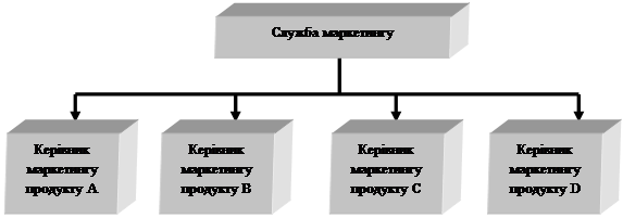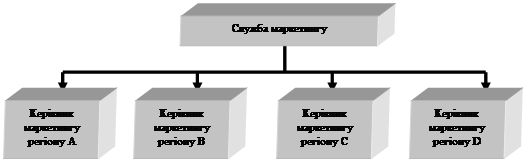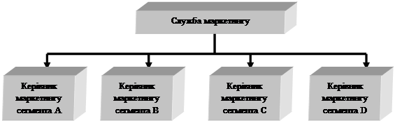Рис. 1.6. Матрична (функціонально-товарна) структура служби маркетингу Отже, функціональна структура служби маркетингу передбачає розподіл обов’язків між відділами щодо виконання певних маркетингових функцій. Товарна поширена на великих підприємствах з диверсифікованим виробництвом, які випускають широкий асортимент товарів за різними технологіями виробництва. Регіональна актуальна для фірм, які діють на ринках з чітко визначеними межами регіонів, а також за кордоном. Сегментна передбачає наявність на підприємстві окремих відділів, діяльність яких орієнтована на певні сегменти споживачів. Матрична ефективна при широкій номенклатурі продуктів і великій кількості ринків, а також при виведенні нового товару на ринок [ 9 ]. Одним із найскладніших і найвідповідальніших є наступний етап організації маркетингу на підприємстві — розподіл функцій між виконавцями. Для цього можуть бути використані такі підходи: · витратний - виконавець має бути зайнятий повний робочий день, а між виконуваними функціями повинен існувати логічний зв’язок; · управлінський - створення умов для того, щоб процес виконання маркетингових функцій здійснювався послідовно і в одному напрямку; · соціальний - виконувані функції повинні відповідати статусу працівників; · гнучкий - створення можливостей для швидкого реагування на зміну умов навколишнього бізнес-середовища. Відповідно до визначеної структури, завдань та функцій відділу маркетингу здійснюється підбір його працівників. Слід знати, що ті, хто тут працюватимуть, мають задовольняти цілий комплекс вимог, а саме: - відповідати загальним вимогам до управлінських кадрів (компетентність, високі моральні якості, пунктуальність, дисциплінованість, уміння керувати людьми); - мати належні системні знання, кругозір, ерудицію, стратегічне мислення, аналітичні здібності; - бути орієнтованими передовсім на обслуговування споживачів; - мати підприємницькі здібності; - відзначатися творчим, новаторським ставленням до справи; - володіти умінням вести переговори, знати іноземні мови; мати спеціальну підготовку в галузі менеджменту та маркетингу; - добре володіти комп’ютером. Останніми етапами формування маркетингової організаційної структури підприємства є розроблення та запровадження системи стимулювання праці та контроль за діяльністю, який дає змогу здійснювати відповідні коригувальні дії. Наявні сьогодні системи стимулювання праці застаріли і не працюють на збільшення обсягів виробництва і підвищення ефективності праці маркетологів. Ігнорування вад сформованої системи оплати і стимулювання праці є однією з основних причин кризового стану економіки і суспільства. Наприклад, зарплата маркетолога має складатися з двох частин: основна зарплата, що виплачується за виконання посадових обов’язків, та змінна частина, що залежить від підсумків результатів трудової діяльності у попередній місяць. Цю частину зарплати формує трудовий колектив у вигляді премії, тому що маркетолог, реалізуючи на підприємстві свої підприємницькі здібності, віддає результати своєї праці колективу, який оцінює його індивідуально. У цілому по Україні реальний попит на фахівців з маркетингу дуже значний, але він частково має прихований характер. Маркетолог сьогодні — це єдиний фахівець, який може вказати підприємст