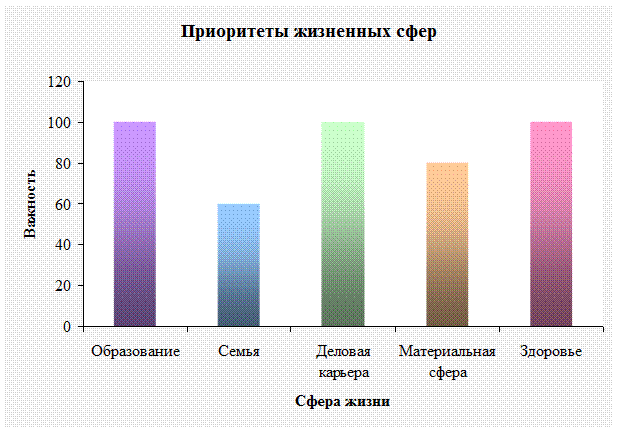2. Анализ значимости сфер жизнедеятельности Каждая цель в жизни любого человека имеет свою важность: высокую (100%), среднюю (60%) и низкую (20%). Такая расстановка по важности цели по ее приоритетам просто необходима для того, чтобы определить, что на первом месте, а что на втором, что главное, на чем нужно сконцентрироваться для получения максимального результата, а что второстепенное. Важная задача предполагает планомерных и пошаговых действий, которые в совокупности могут привести к исполнению желаемой цели. Все сферы в жизни любого человека играют большую роль, и если какая – либо сфера жизни будет отсутствовать, то человек будет чувствовать себя ущемленным. Будь то семья или карьера, образование или имущество – только совокупность всех этих сфер даст нам удовлетворенность в жизни. Необходимым условием здесь является лишь установление приоритетов – что важнее, чем можно пожертвовать, чтобы получить необходимое. Вся жизнь – постоянный выбор между значимым и незначимым. Без этого выбора нельзя добиться больших успехов в своей деятельности. Для меня самым главным является сфера здоровья, ведь без хорошего здоровья практически нечего в жизни добиться нельзя как в личной сфере, так и в профессиональной. Так же важным является образование, без которого трудно построить карьеру, и деловая карьера без которой не возможно удовлетворить свои потребности в материальной сфере и, следовательно, трудно построить благополучную семью. Каждая цель имеет свой смысл тогда, когда установлены сроки ее воплощения и сформулированы желаемые результаты. Попробую сформулировать их применительно к своим желаемым и практическим целям и проверю свои планы с точки зрения реалистичности (см. табл. «Жизненный план»). Так же план жизни по сферам можно представить графически: график «Образование»; график «Деловая карьера»; график «Материальная сфера»; график «Семья»; график «Здоровье».